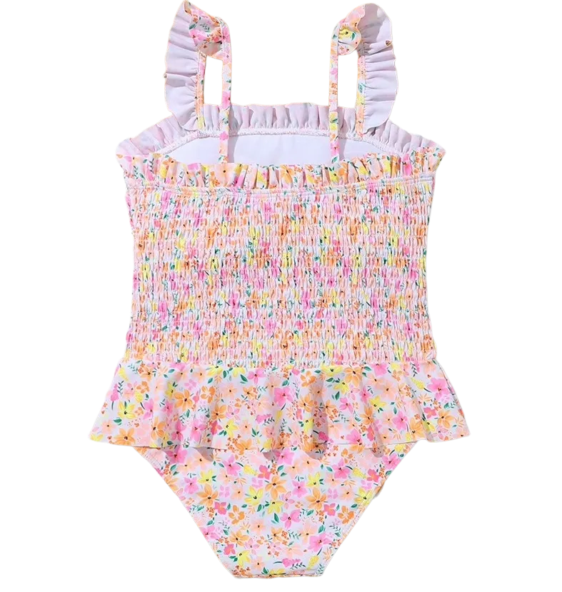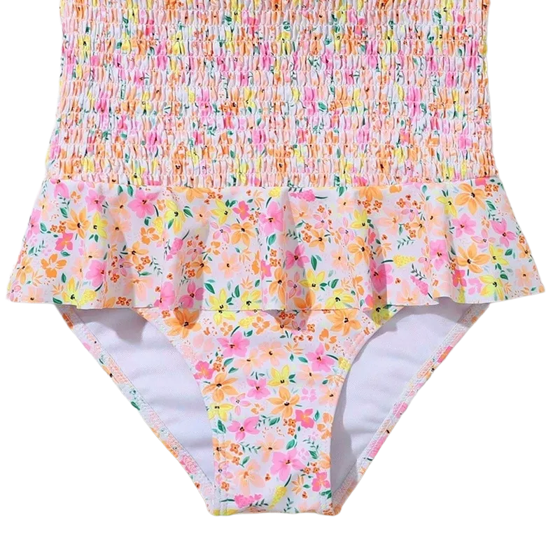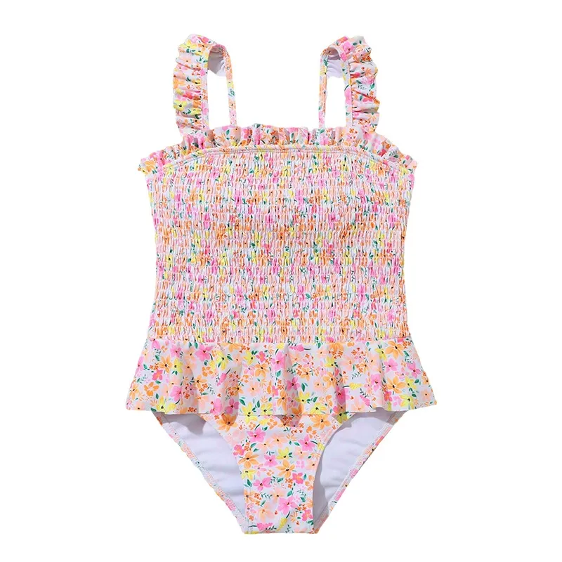 Custom Girls Floral Print Ruffle Strap Smocking One-Piece Bathing Suit Swimsuit