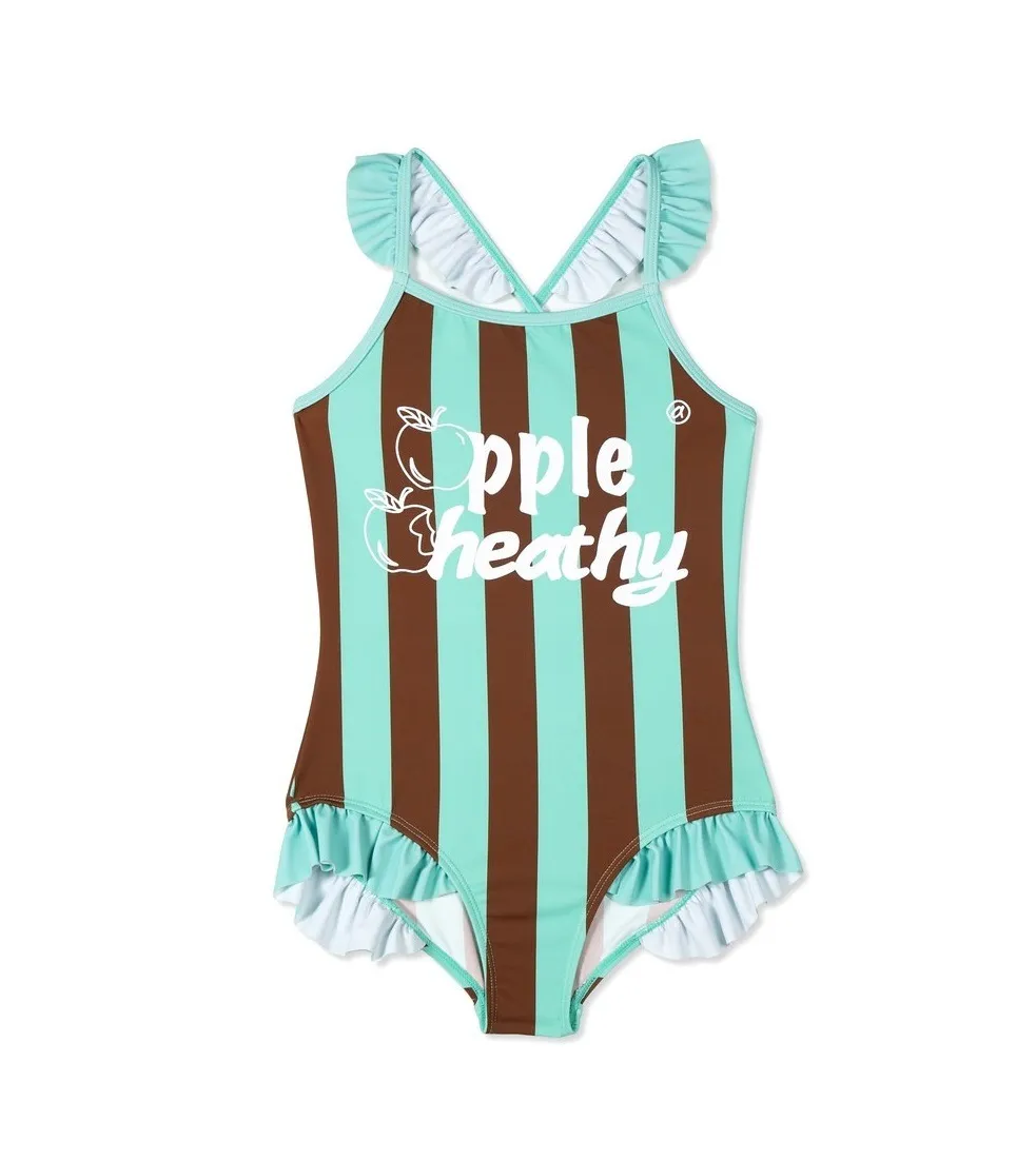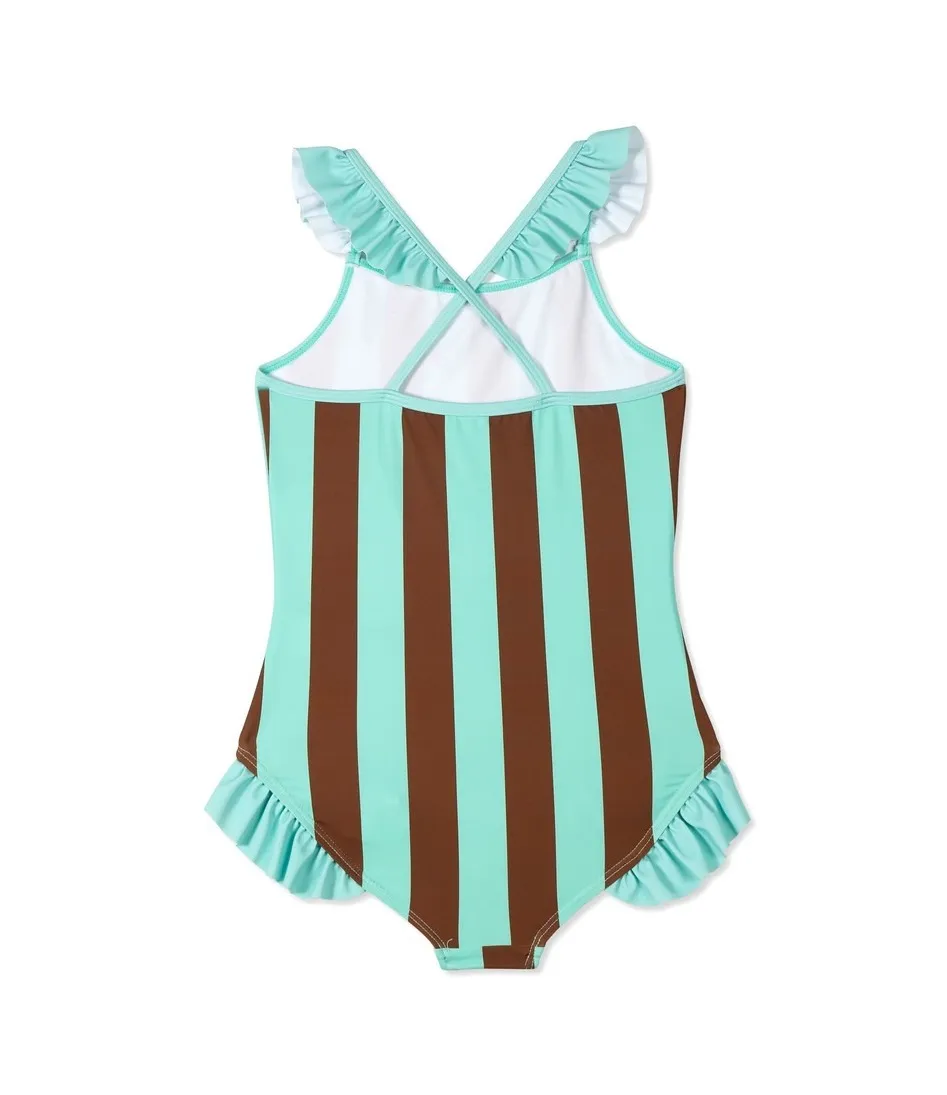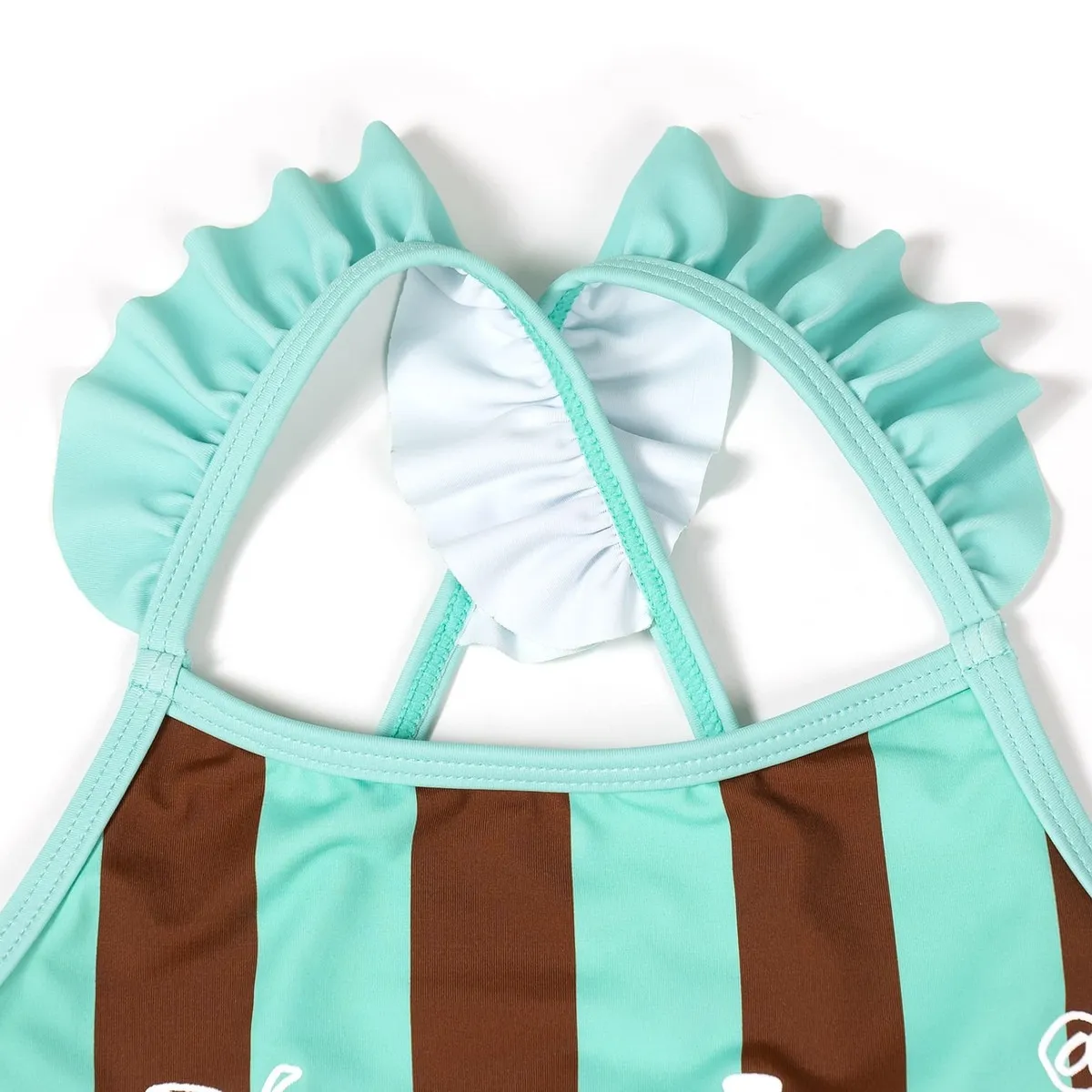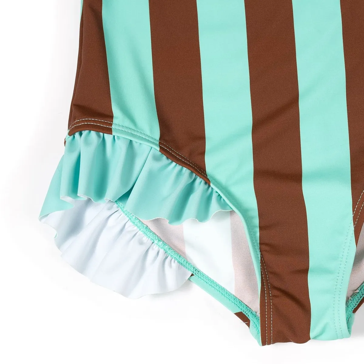 Custom Girls Striped Bathing Suit One Piece with Shoulder Frill and Leg Trim