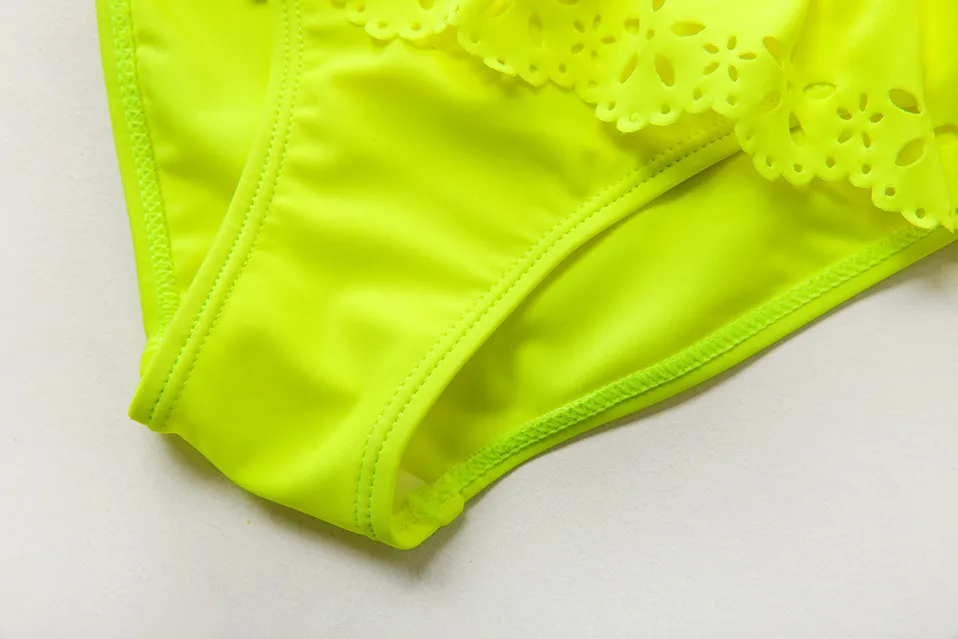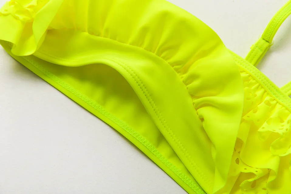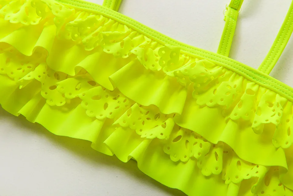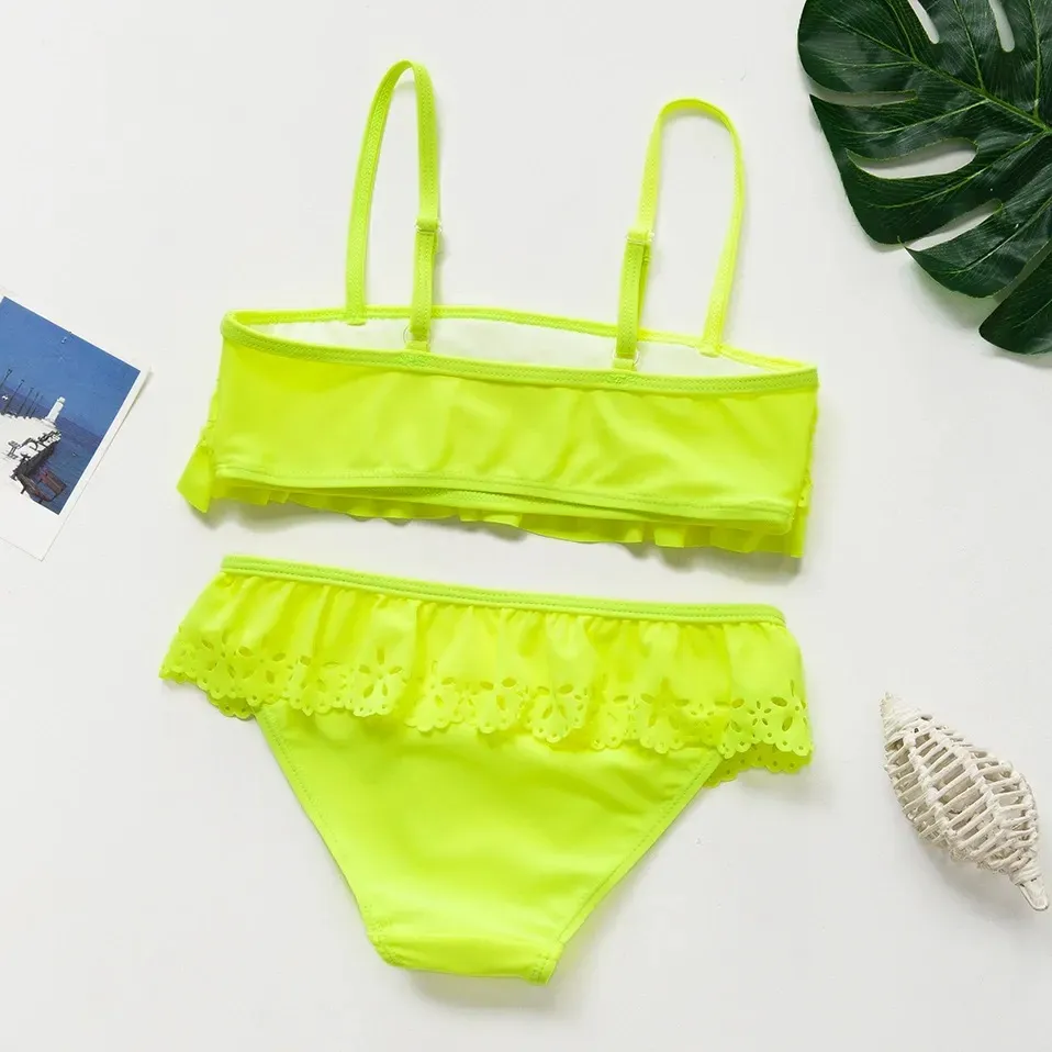 Girls bikini set with laser-cut front & back ruffle bottom, UPF50+, adjustable straps; OEM supplier for kids swimwear wholesale orders.