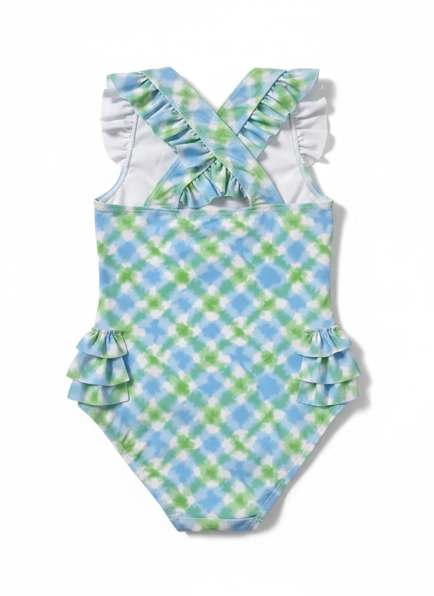 Girls’ one piece swimsuit with ruffle trim, chlorine resistant tie-dye fabric, OEM/ODM swimwear manufacturer supply.