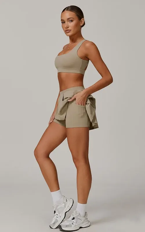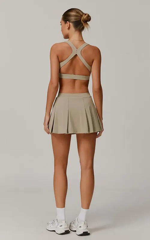 A stylish and functional tennis set featuring a supportive sports bra and a pleated skirt with built-in shorts, designed for performance and comfort on the court.