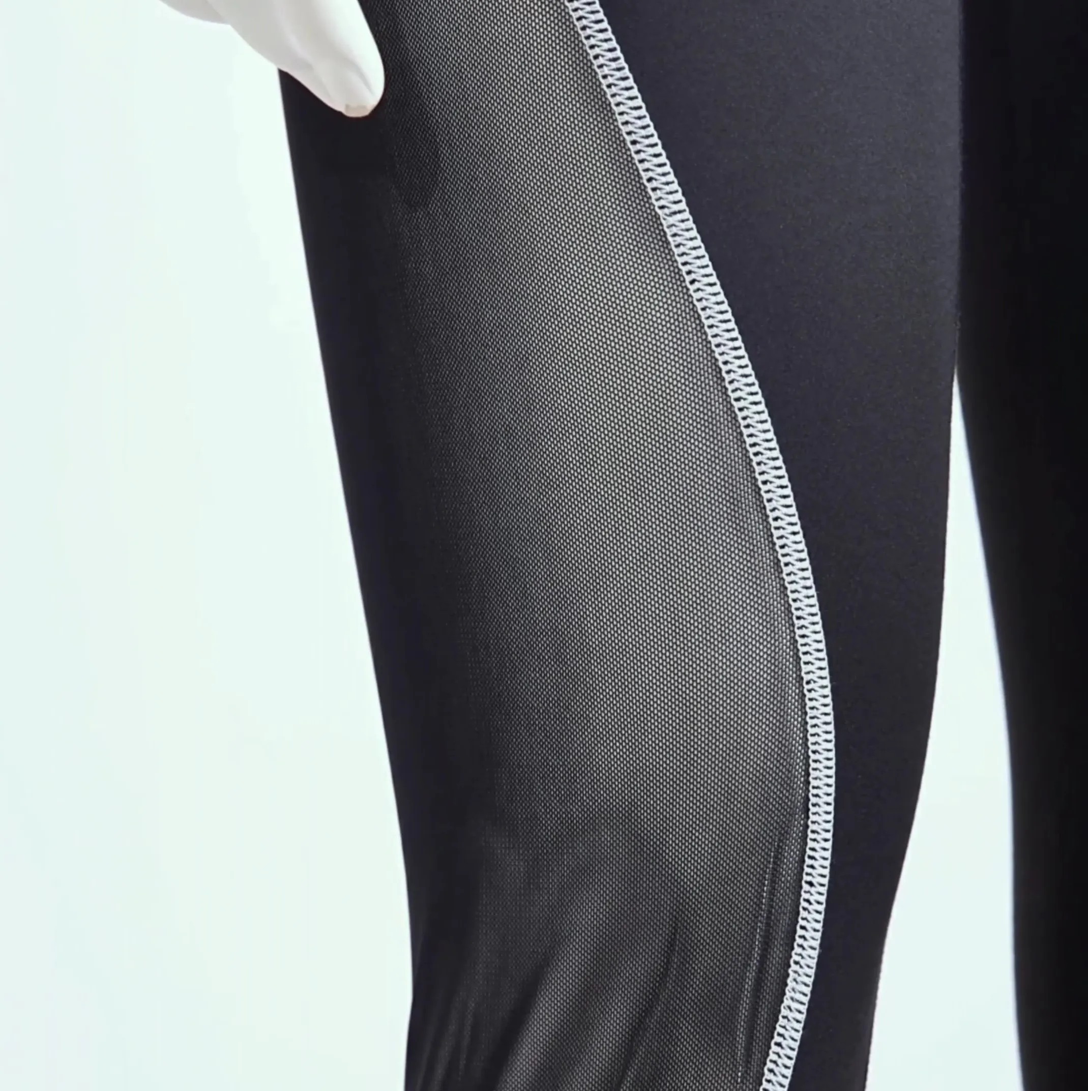 High Waist Mesh Panel Yoga Leggings – Black Sheer Workout Tights for Women are manufactured by Vista Clothing, a leading OEM activewear supplier. Designed with bold mesh paneling and contrast white piping, these leggings combine functionality with modern aesthetics. Crafted from breathable nylon-spandex fabric, they offer comfort, stretch, and shape retention, making them ideal for yoga, gym sessions, or athleisure fashion collections. Our factory supports wholesale, bulk orders, and private label customization.