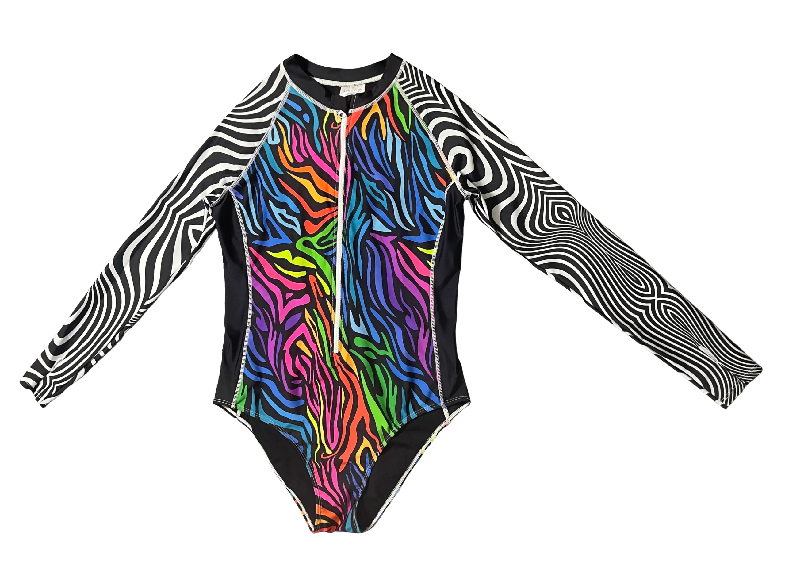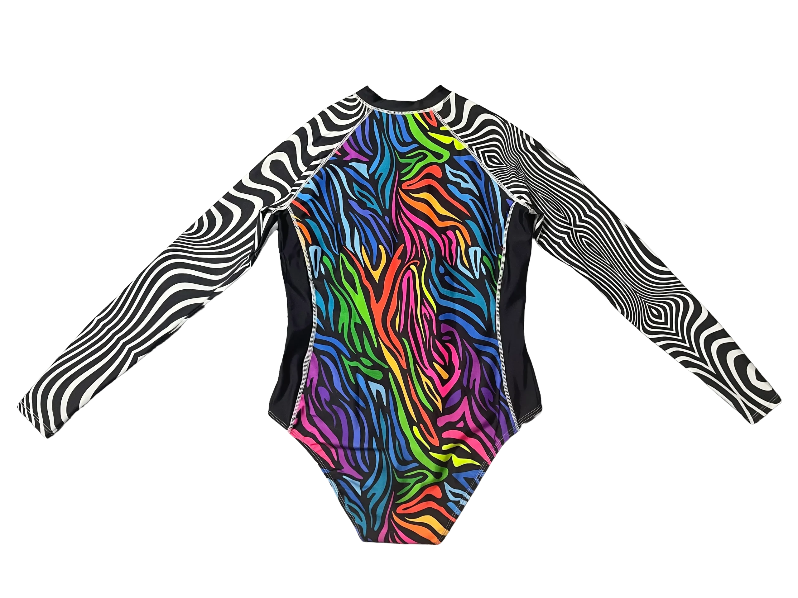 The Carvico Long Sleeve Rash Guard Swimsuit – Women’s One Piece UPF50+ Chlorine Resistant is designed for both performance and style. Featuring a bold rainbow zebra pattern with black and white contrast sleeves, this swimsuit provides full arm coverage for enhanced UV protection. Made with premium Italian Carvico fabric, it ensures durability, four-way stretch, and chlorine resistance, making it ideal for frequent pool use or beach activities. Removable cups provide customizable support. As a professional swimwear manufacturer and wholesale supplier, Vista Clothing offers OEM/ODM customization for bulk buyers seeking private label swimwear solutions.